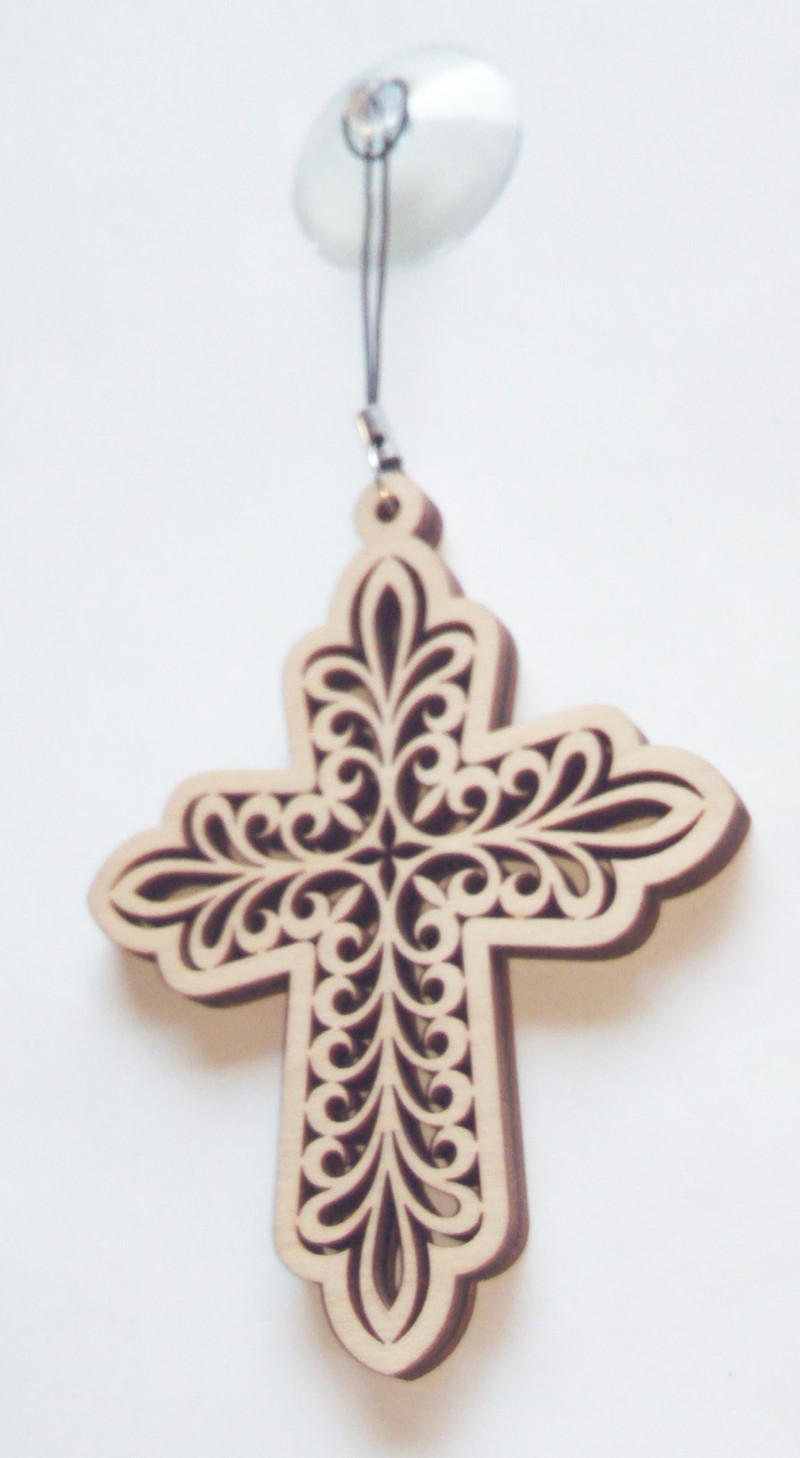 Резной деревянный крест. Он имеет замысловатый узор из завитков и цветочных элементов, вырезанных в дереве. В верхней части креста находится небольшой круглый элемент с отверстием, предназначенным для подвешивания.