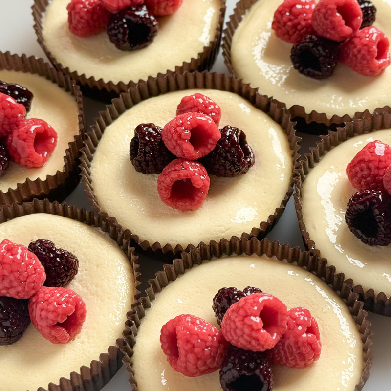 Наш десерт украшен желе-ягодками, в составе которых только натуральное пюре черники, малины и клубники,