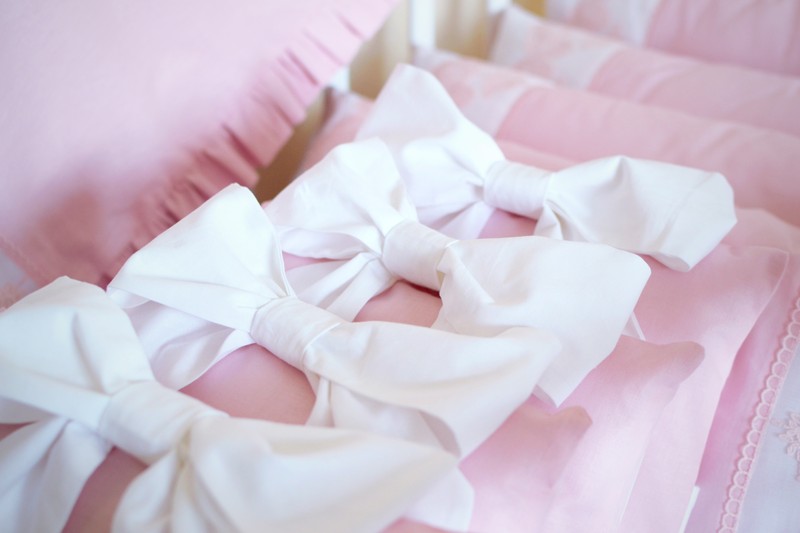 Пододеяльник декорирован рюшей. Бортики-подушки выполнены с завязками основной ткани. Бортики-подушки декорированы съемными бантами и кружевом.