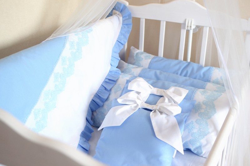 Пододеяльник декорирован рюшей. Бортики-подушки выполнены с завязками основной ткани. Бортики-подушки декорированы съемными бантами и кружевом.