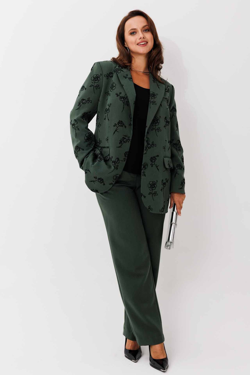 Деловой брючный костюм с нотками романтизма в восхитительном изумрудном цвете. Ткань на жакете с объемными цветами из флока, которые добавляют изюминку образу. Размерный ряд 48-54. Рост 164.