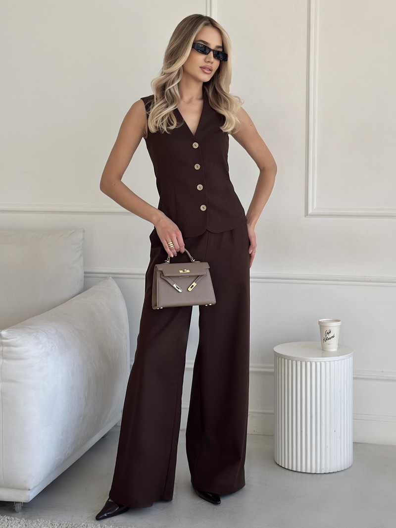 Женский костюм двойка с жилеткой из льна - это стильное решение на весенний и летний период! Невероятно удобная и модная модель базовой молодежной одежды на теплое и демисезонное время года (весна и лето). В льняном костюме двойке каждая женщина будет чувствовать себя комфортно, стильно и женственно одновременно: комплект состоит из широких брюк и подходящей к ним жилетки на пуговицах. Штаны с удобными карманами и жилет: классический костюм прекрасно смотрится на любой фигуре. Подходит для девушек среднего роста от 165 до 170 см. Такие нарядные вещи идеальны для девочек подростков и девушек, визуально удлиняет ножки. Женский комплект двойка на весну и лето 2025 универсальный и удобный, подходит для повседневного ношения. Это отличный вариант для делового или не строгого образа: прогулок и свиданий, в офис, институт.