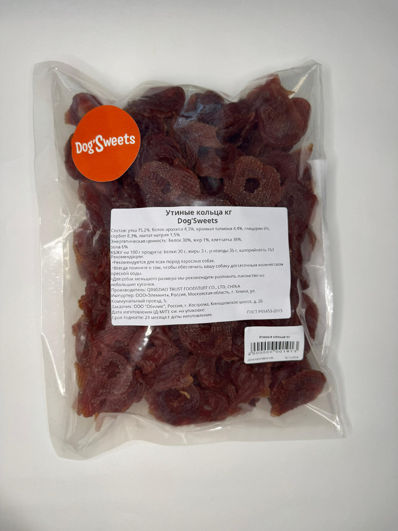 Состав: Утка 85%, растительный белок 5.5%, крахмал 3%, глицерин 4%, сорбит 2%, ароматизатор 0.4%, сорбат калия 0.1%.”