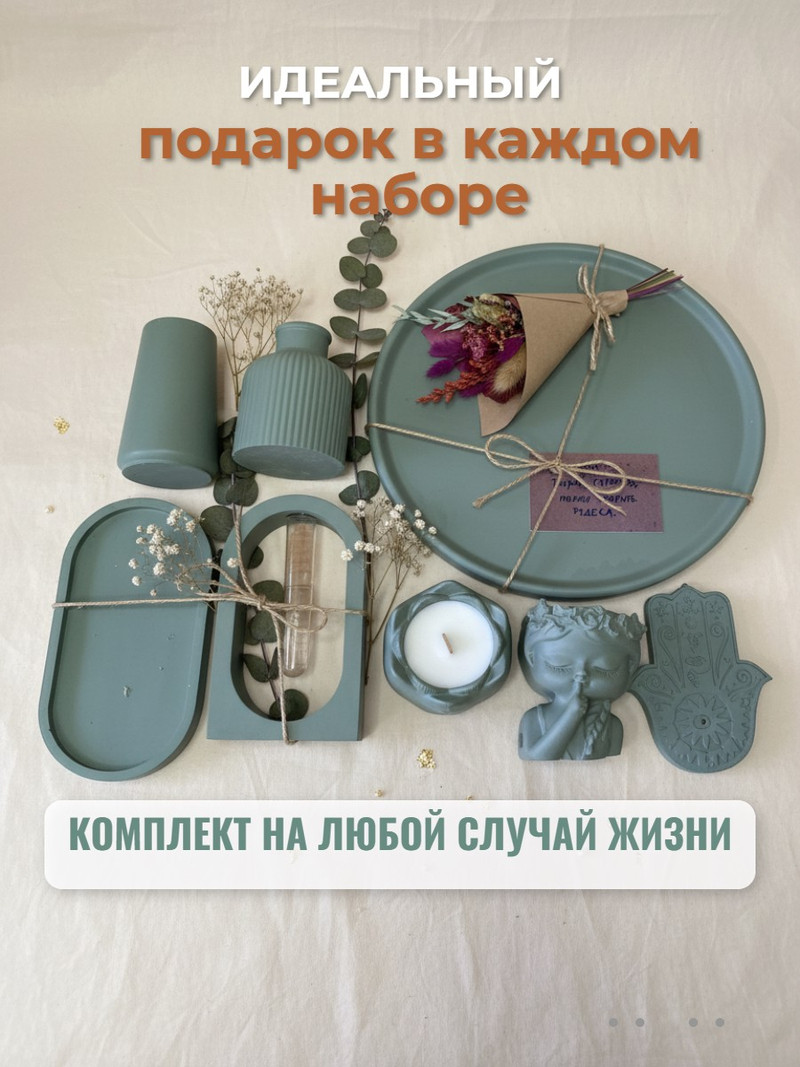 В состав комплекта входит: большая, круглая подставка под всякую мелочь, маленькая подставка, кашпо, 2 вазы под деффузор или сухоцветы, ваза с колбой под срезанный цветок, подсвечник многоразовый, подставка под благовония, букет с сухоцветами, открытка, инструкция по уходу за гипсовыми изделиями.