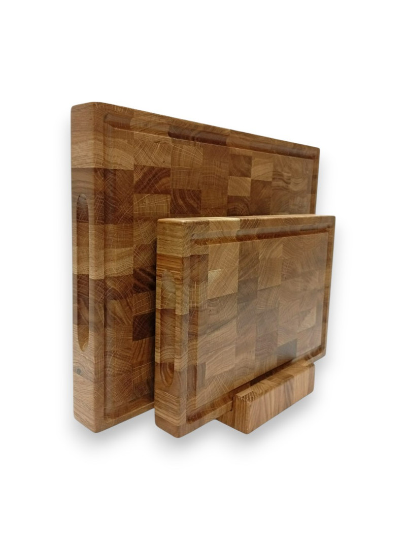 Набор торцевых разделочных досок на подставке, изготовлены из дуба, двухсторонние с желобом для сбора жидкости и ручками по бокам, обработаны минеральным маслом.