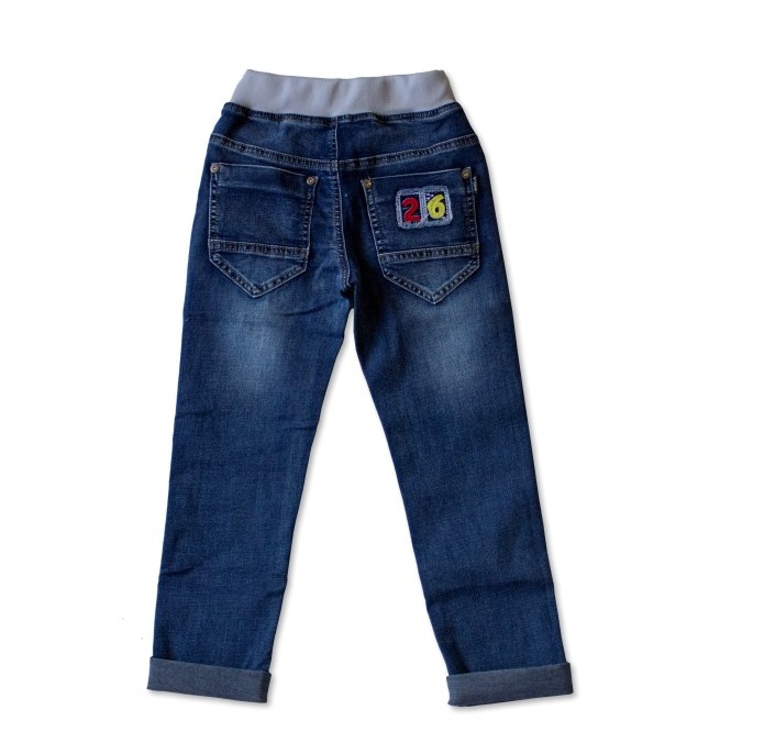 Брюки из плотной синей джинсовой ткани. На поясе удобная резинка. размерный ряд 116,122,128,134,140см.