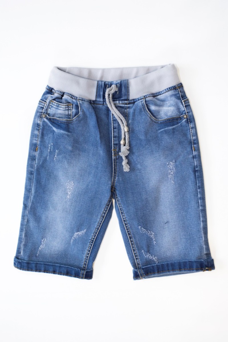 Шорты-бермуды из синей джинсовой ткани с потертостями для подростков. На поясе удобная резинка. Размерный ряд 140,146,152,158,164,170 см.