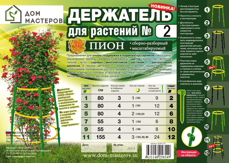 Монтаж любого держателя можно производить поэтапно по мере роста, расцвета куста, растения, цветка, путем наращивания конструкции по высоте и дополнитело усиливая поддерживающими поясами