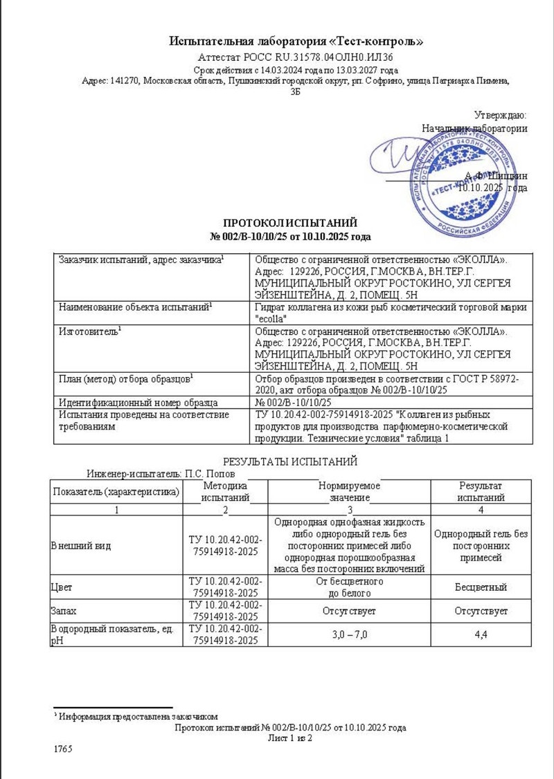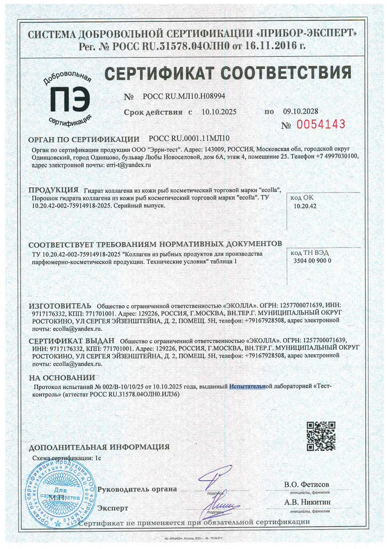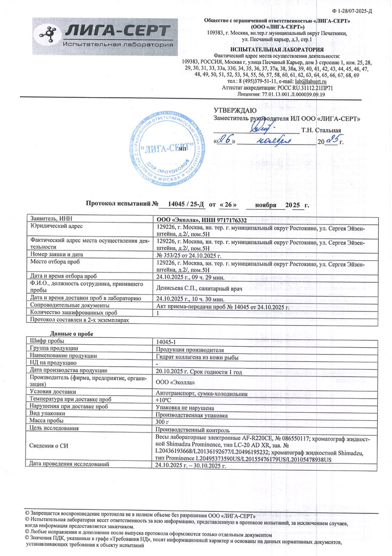Гидрат коллагена из кожи диких пресноводных рыб с использованием инновационной технологии холодной обработки. Данная технология позволяет достигать максимальной эффективности, обеспечивая выход до 98% активных компонентов