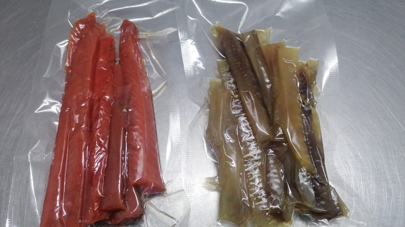 Соломка из филе белой и красной рыбы в вакуумной упаковке по 100 г. Срок годности 6 мес.