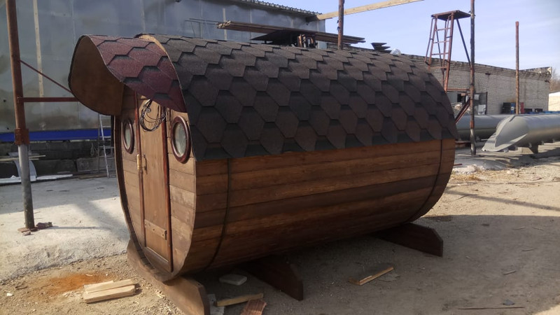 Снаружи баня обработана колировочным антисептиком, крыша мягкая черепица, уличная лампа освещения 1 шт. Фундамент не требуется. Баню можно использовать сразу после установки. Монтируется за один день. При необходимости баню можно передвинуть, либо перевезти. Оригинальная форма бани позволяет сохранить тепло на долго и обеспечивает равномерное распределение пара в воздухе.