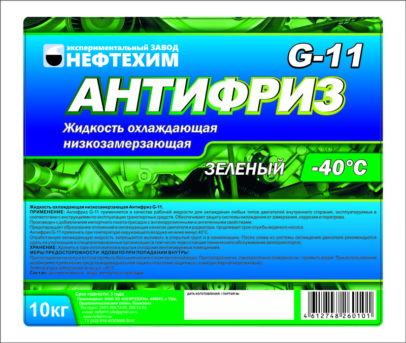 Производство ООО “Экспериментальный завод “Нефтехим”. Технология и рецептура производства жидкости охлаждающей “Антифриз” соответствуют требованиям ГОСТа и подтверждается ОТК (отделом технического контроля). Высококачественная охлаждающая низкозамерзающая жидкость, предназначенная для охлаждения двигателей внутреннего сгорания легковых и грузовых автомобилей (импортного и отечественного производства). Основу антифриза составляют водный раствор этиленгликоля и соли карбоновых кислот (карбоксилаты), обеспечивающие двигателю надежную защиту от замерзания, перегревания, коррозии и образования накипи.