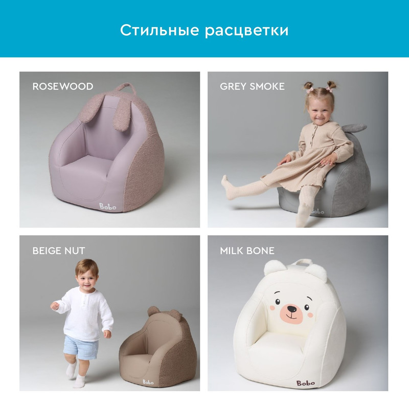 Детское интерьерное кресло Bobo — это стильный, мягкий, прочный и удобный стул для проведения досуга и игр малышей от момента, когда малыш впервые уверенно сел и до 4 лет -идеальное решение для создания уютного и функционального уголка в детской комнате вашего ребенка.