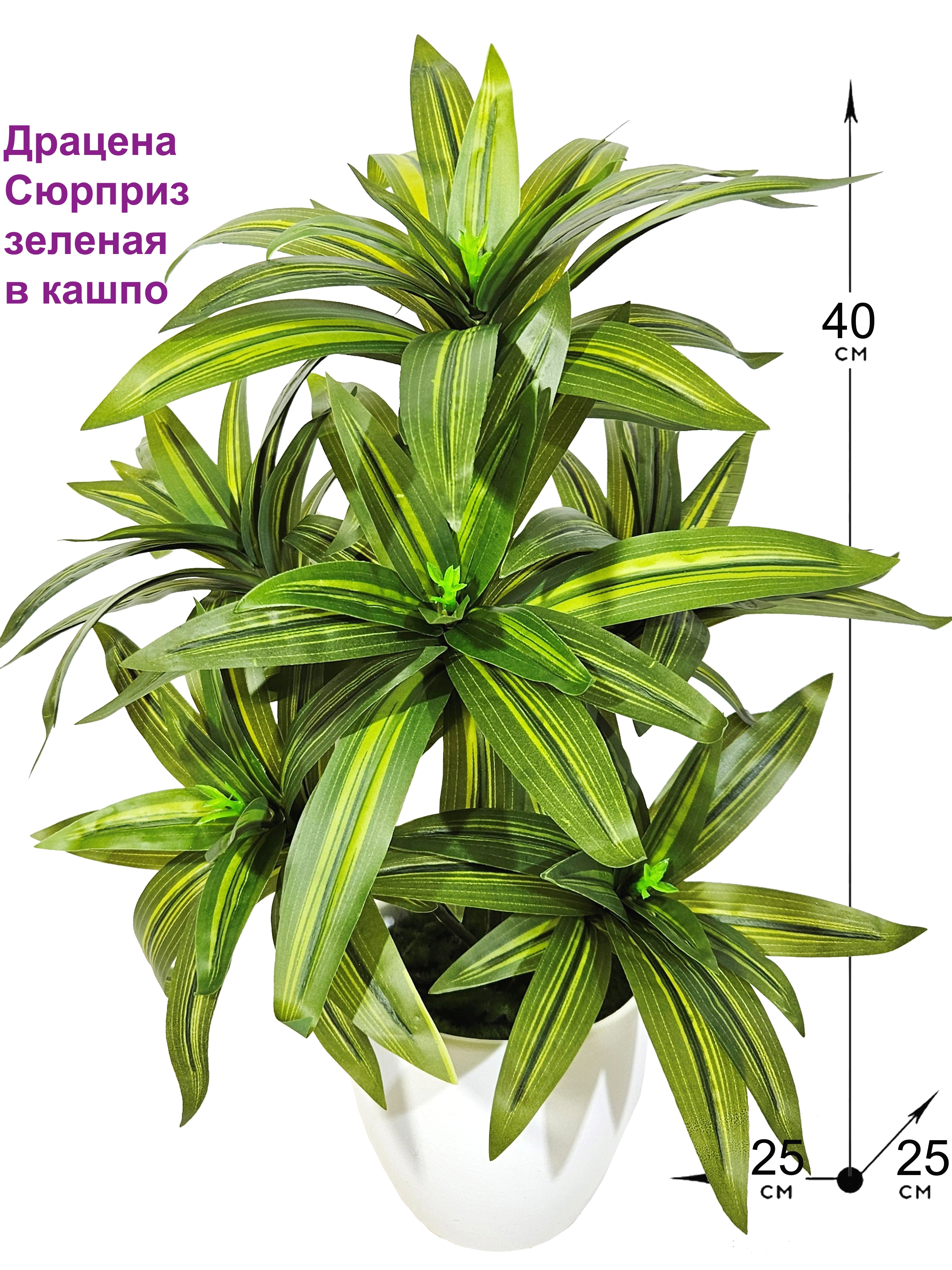 Очень реалистичное искусственное растение в кашпо - Драцена Сюрприз - станет украшением Вашего интерьера! Декоративное растение в кашпо не требует особого ухода, не боится влаги, можно ставить в ванную комнату, к бассейну и в сауну. Драцена декоративная в кашпо - это оригинальный элемент дизайна гостиной или рабочего кабинета, она украсит коридор или балкон, кухню или лоджию. Драцена сделает любую жилую комнату уютной, особенно если мало света и живые растения не растут.Габариты драцены в кашпо ВхШхГ: 40х25х25 см.Большая просьба заказывать наши изделия заранее, доставка может быть более долгой, чем обычно.Если данный товар не доставляется в Ваш регион или его нет в наличии, Вы можете обратиться к нашему менеджеру.