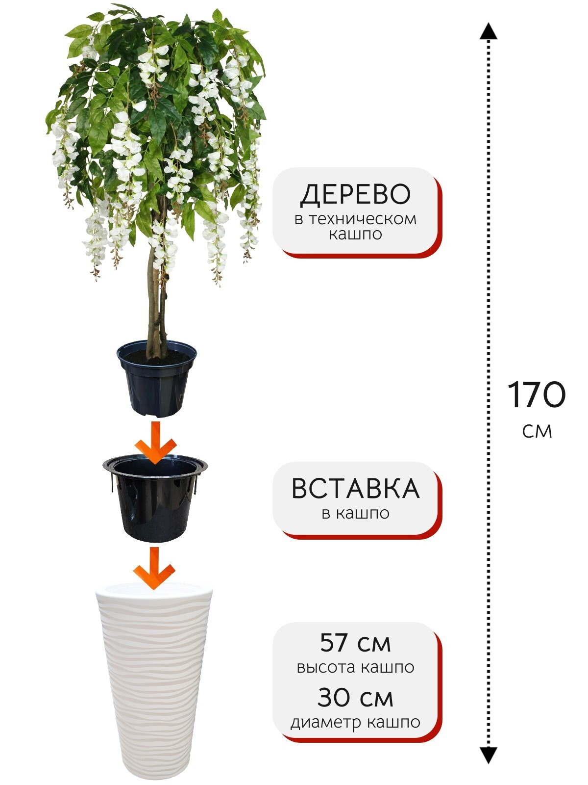 Дерево искусственное интерьерное - Акация 170см в напольном высоком кашпо – отличный выбор для украшения помещения, для озеленения частного дома, салона красоты, свадебного салона. ФитоПарк представляет данную модель, которая позволит создать атмосферу природы и роскоши в вашем доме или офисе. Искусственные высокие цветущие деревья для интерьера – это модный тренд современного дизайна, который придает пространству оригинальность и стиль. Декоративное растение белая Акация имеет размах кроны 60см, что позволяет ему стать ярким акцентом для любой комнаты, для спальни и гостиной, для коридора или балкона. Цветущее искусственное дерево для интерьера дома добавит в комнату нотки весеннего настроения и свежести. Искусственная глициния свисающая создаст эффект легкости и воздушности. Сакура белая, искусственное высокое дерево в кашпо, известное своими нежными цветами, как и Дерево акация белая, станет уникальным украшением вашей свадьбы, фотозоны, торжества и любого мероприятия. Декор для свадьбы – это важный элемент создания романтической атмосферы, и искусственные растения и цветущие деревья великолепно выполняют эту функцию.Габариты дерева вместе с кашпо: 170х60х60см. Поставляется в разобранном виде.Большая просьба заказывать наши изделия заранее, доставка может быть более долгой, чем обычно.Если данный товар не доставляется в Ваш регион или его нет в наличии, Вы можете обратиться к нашему менеджеру.
