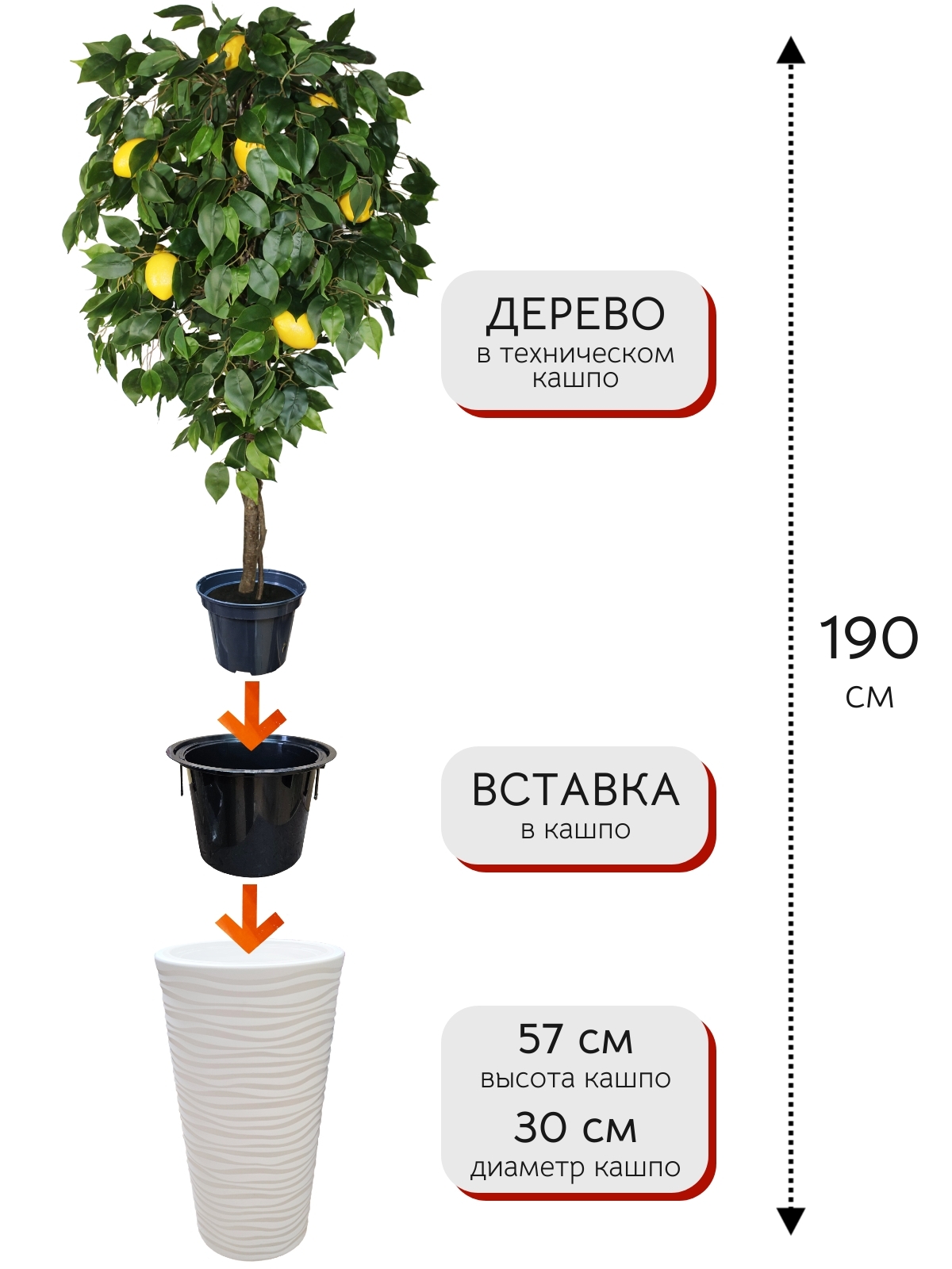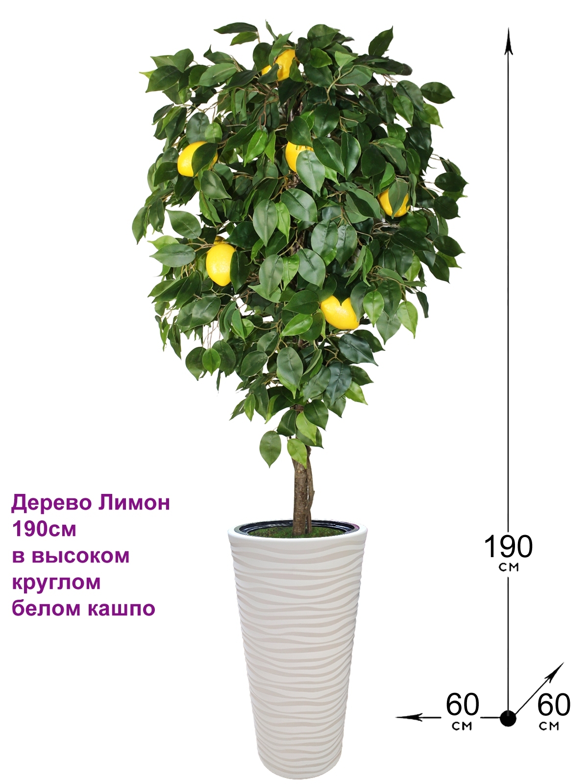 Современные технологии позволяют делать самые различные декоративные растения и деревья так, что не отличишь от настоящих. Поэтому дизайнеры все чаще выбирают искусственные деревья для декора квартиры и офиса, спортзала, зоны отдыха, дачи, а также для оформления фотозоны. Высокое напольное растение в красивом кашпо будет смотреться роскошно в интерьере любой комнаты: гостиной, спальни, ванной. Украсит балкон или террасу, входную зону или коридор. Отличный декор для кухни. Декоративный лимон на натуральном стволе с плодами может быть как самостоятельным элементом, так и стать фокусом цветочной зеленой композиции. Искусственное дерево - оригинальный подарок для мужчин и женщин на любой праздник. Наши декоративные цветы украсят день рождения, выпускной! Ветки лимонного дерева сделаны из прочной металлической проволоки, она легко гнется и хорошо держит форму. Каждое дерево сделано вручную, поэтому внешний вид готового растения может незначительно отличаться от фото. Ствол дерева разъемный, соединяется в один клик штифтом. Габариты дерева в кашпо: 190х60х60см. Поставляется в разобранном виде.Большая просьба заказывать наши изделия заранее, доставка может быть более долгой, чем обычно.Если данный товар не доставляется в Ваш регион или его нет в наличии, Вы можете обратиться к нашему менеджеру.