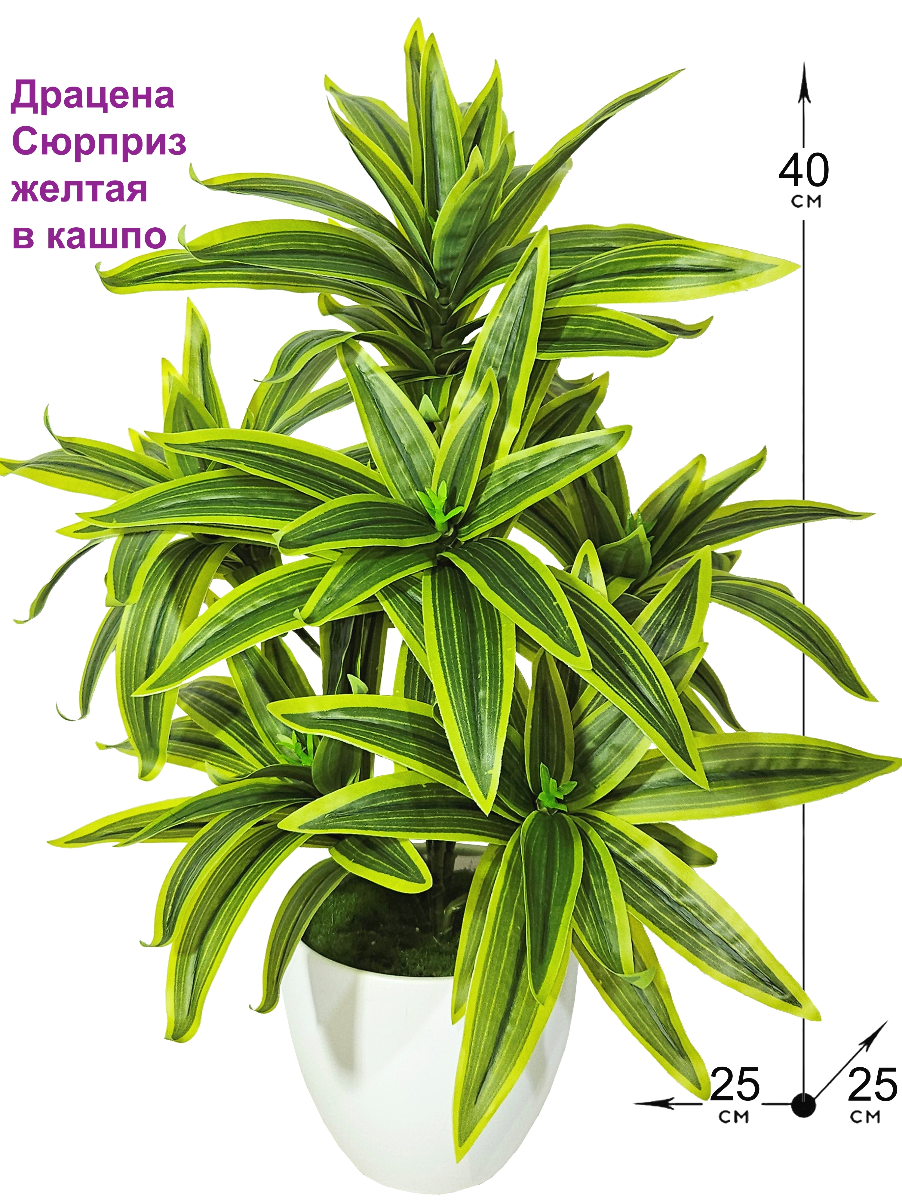 Очень реалистичное искусственное растение в кашпо - Драцена Сюрприз - станет украшением Вашего интерьера! Листочки выполнены из качественного плотного латекса. Декоративное растение в кашпо не требует особого ухода, не боится влаги, можно ставить в ванную комнату, к бассейну и в сауну. Драцена декоративная в кашпо - это оригинальный элемент дизайна гостиной или рабочего кабинета, она украсит коридор или балкон, кухню или лоджию. Драцена сделает любую жилую комнату уютной, особенно если мало света и живые растения не растут.Габариты драцены в кашпо ВхШхГ: 40х25х25 см.Большая просьба заказывать наши изделия заранее, доставка может быть более долгой, чем обычно.Если данный товар не доставляется в Ваш регион или его нет в наличии, Вы можете обратиться к нашему менеджеру.