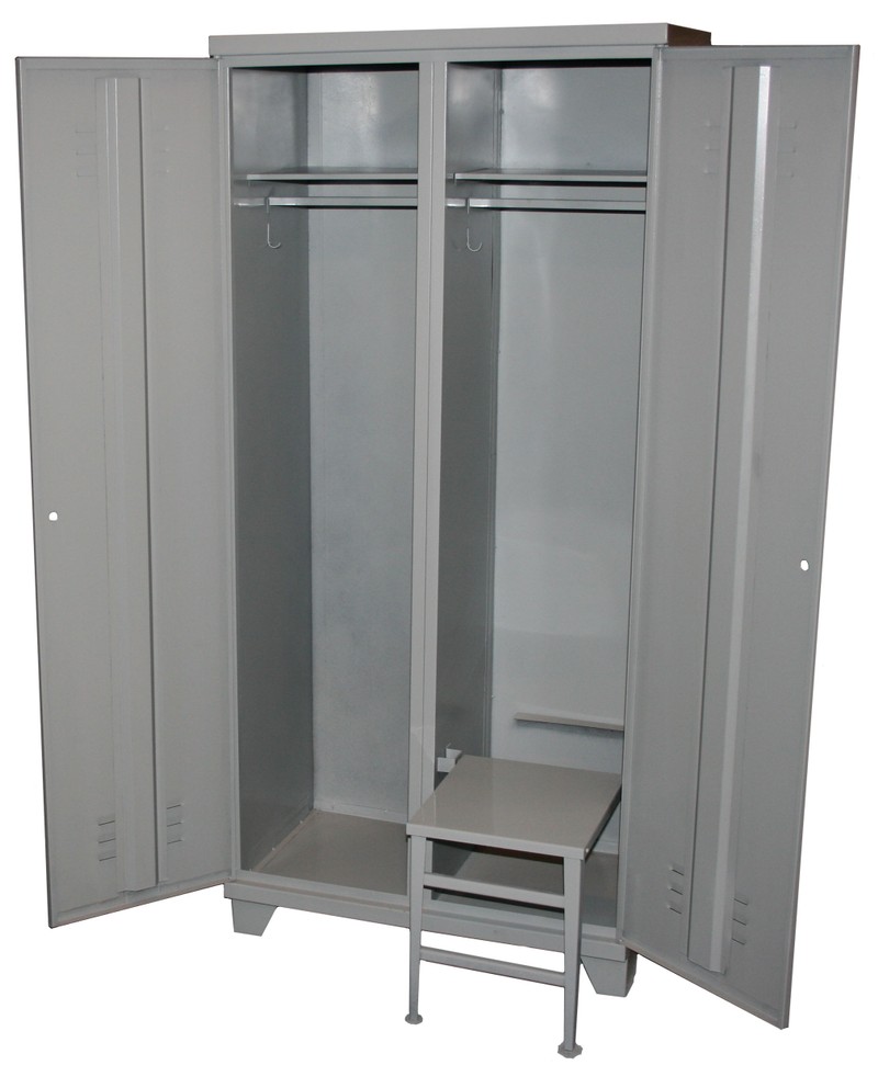 Размер: 800х500х1850 мм 2 двери, 2 полок, вертикальная перегородка каждая дверь отдельно закрывается на почтовый замок цельносварная конструкция, на ножках толщина металла 0, 6 мм покраска: корпус эмаль двери — полимерно-порошковое покрытие. В левой секции 1 полка перекладина. В правой 1 полка 2 крючка, перекладина, сиденье.