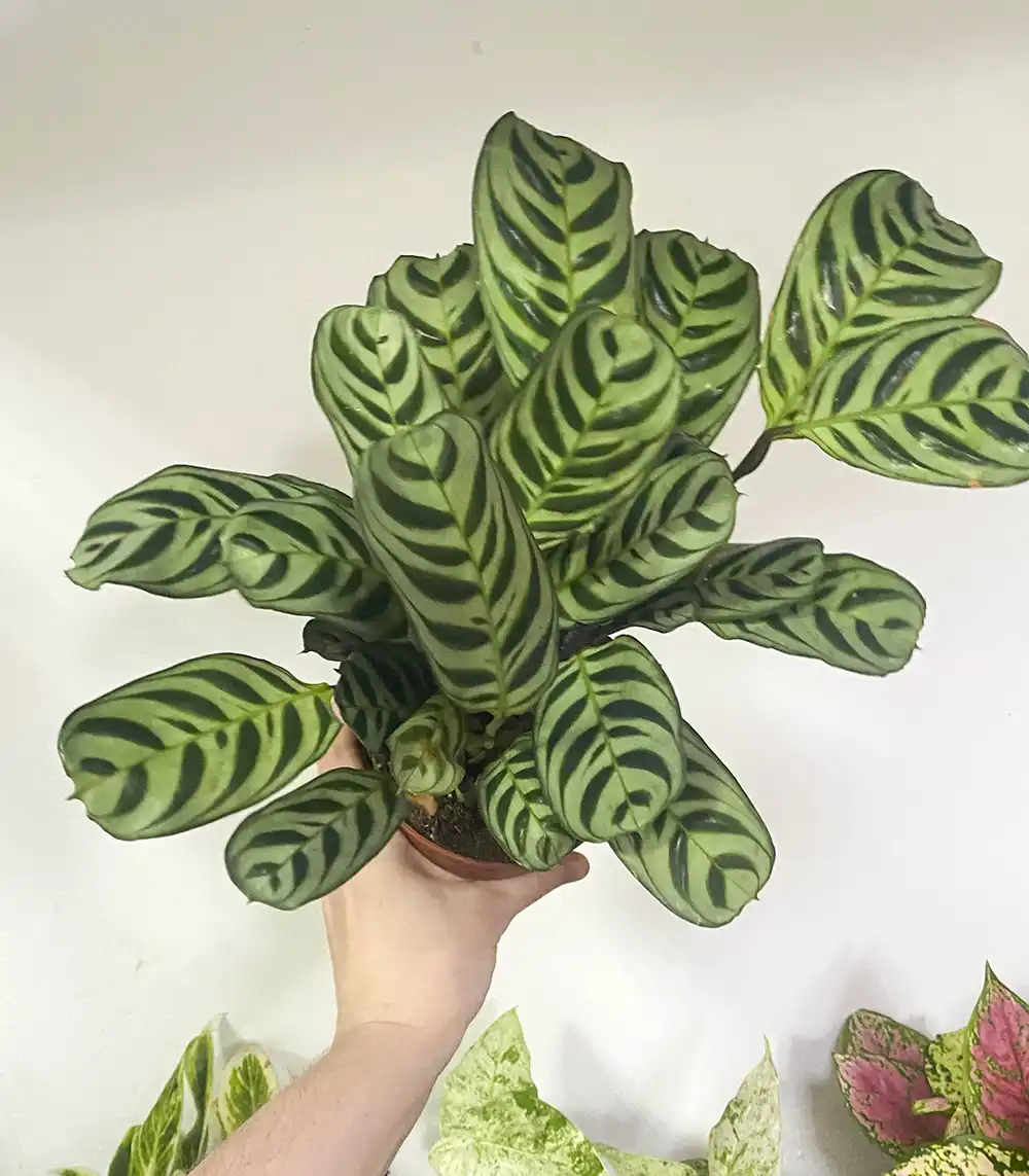 Ктенанта Амабилис — элегантное комнатное растение из семейства марантовых. Её листья украшены симметричным узором в виде перьев или ёлочки, а нижняя сторона имеет сиреневый оттенок. Это растение прекрасно переносит полутень и высокую влажность, идеально подходит для квартир и офисов. Добавляет изысканности и уюта любому интерьеру.