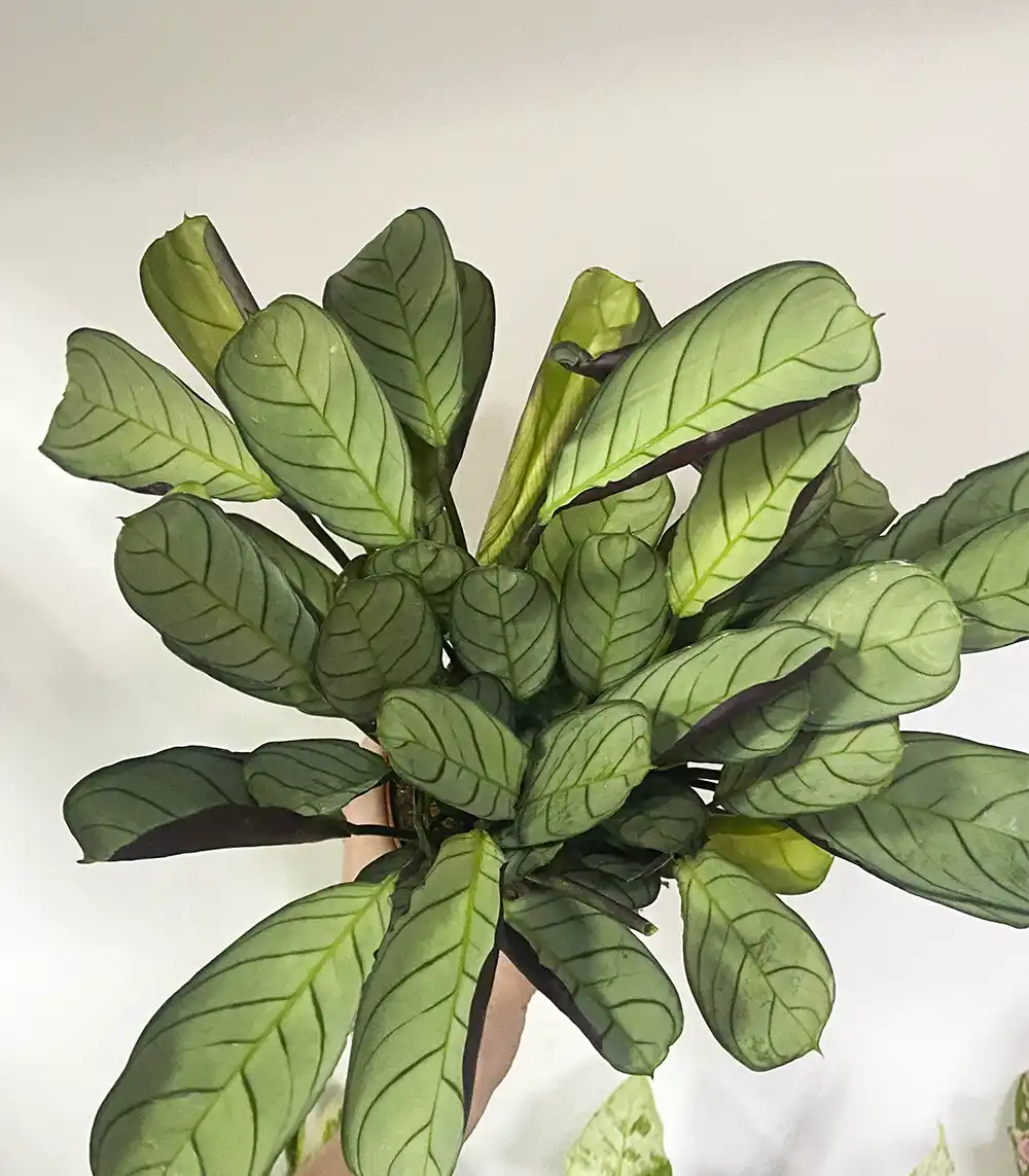 Ктенанта Амагрис — стильное декоративно-лиственное растение из семейства марантовых. Обладает уникальной окраской: серо-зелёная бархатистая поверхность с чёткими зелёными прожилками и контрастной фиолетовой обратной стороной. Любит высокую влажность и рассеянный свет, хорошо чувствует себя в условиях квартиры. Подходит для современных, скандинавских и минималистичных интерьеров. Проста в уходе и безопасна для домашних животных.