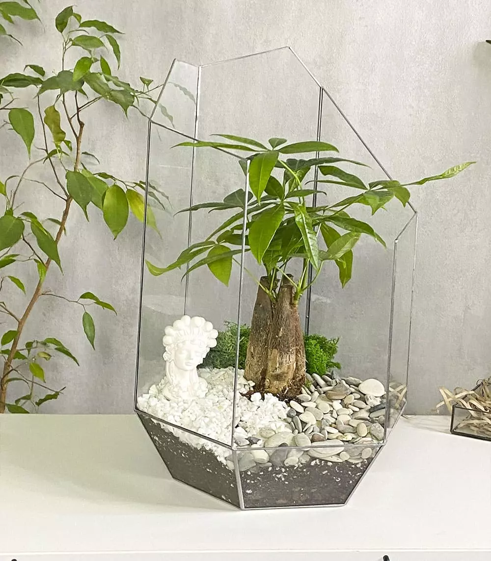 Современный дизайн: Минималистичный и стильный флорариум идеально дополняется пышной кроной пахиры, формируя неповторимый визуальный эффект.