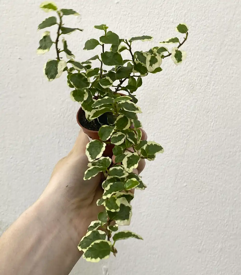 Фикус Пумила Санни — миниатюрный вьющийся фикус с пёстрой листвой: его мелкие сердцевидные листочки окрашены в яркий зелёный цвет с кремово-белыми или лимонными краями. Это растение активно разрастается, образуя густой зелёный ковёр, и подходит как для ампельного выращивания, так и как почвопокровное во флорариумах и кашпо.