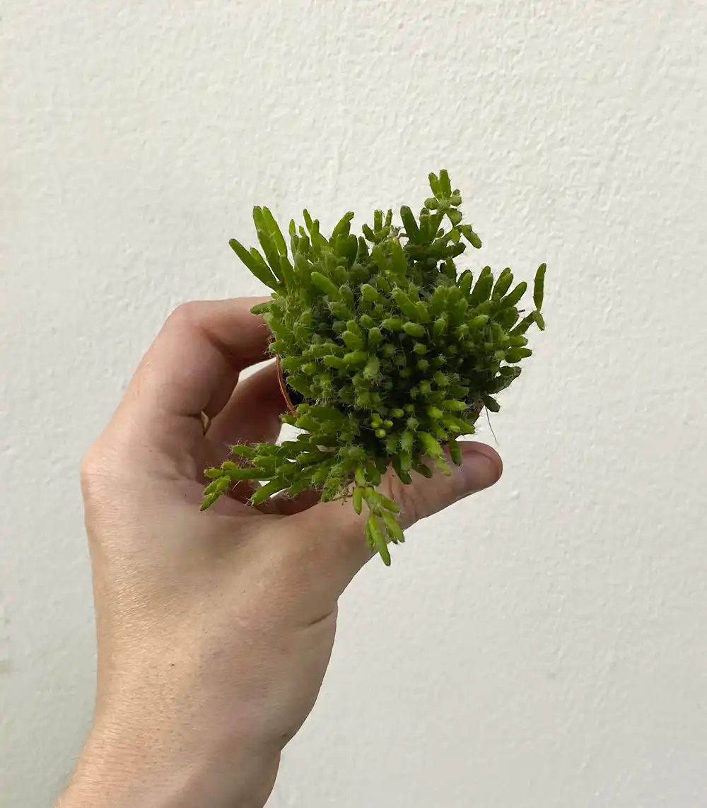 Рипсалис Месембриантемоидея — редкий и эффектный эпифитный кактус с тонкими, пушистыми стеблями, напоминающими мелкие сочные листочки. Его необычный внешний вид делает его любимцем коллекционеров и отличным выбором для подвесных кашпо, флорариумов и стильных интерьерных композиций. В отличие от типичных кактусов, рипсалис не колючий и предпочитает полутень и умеренную влажность.