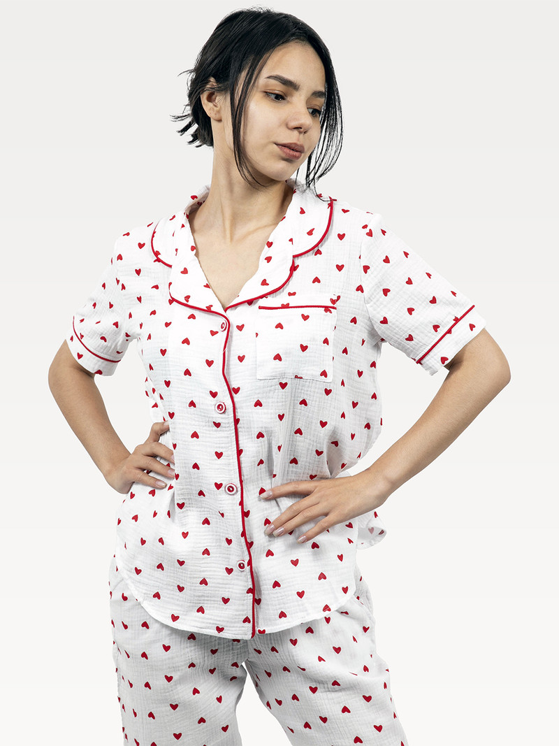 Женская пижама из натурального хлопкового муслина — это идеальное сочетание уюта, лёгкости и стиля. В комплект входят рубашка на пуговицах и свободные штаны, обеспечивающие комфортный сон и приятный отдых. Дышащая, мягкая ткань бережно прилегает к коже, создавая ощущение лёгкости. Очаровательный принт с сердечками добавляет образу нежности и романтики. Отличный выбор для домашнего уюта или в качестве стильного подарка!