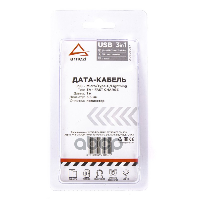 Чтобы купить Дата-кабель зарядный 3в1 USB Micro/Type C/Lightnin ARNEZI арт. A0605037 оптом по цене 367 руб., свяжитесь с поставщиком. Компания поставщик — For-cars (ИП «Иванов Алексей Валентинович») из города Москва. Доставка возможна самовывоз, транспортной компанией, авиатранспортом, железной дорогой. Способы оплаты: наличными, безналичная оплата, электронные деньги.