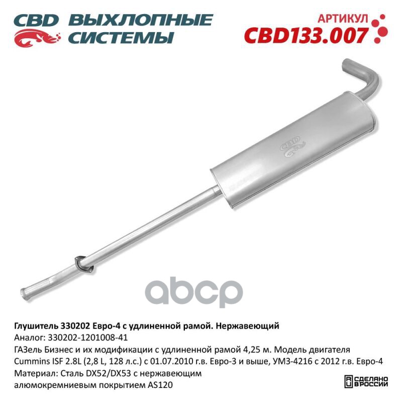 Чтобы купить Глушитель 3302 Cummins 330202.1201008.41 Е4 удлин база Нерж сталь CBD арт. CBD133007 оптом по цене 7093 руб., свяжитесь с поставщиком. Компания поставщик — For-cars (ИП «Иванов Алексей Валентинович») из города Москва. Доставка возможна самовывоз, транспортной компанией, авиатранспортом, железной дорогой. Способы оплаты: наличными, безналичная оплата, электронные деньги.