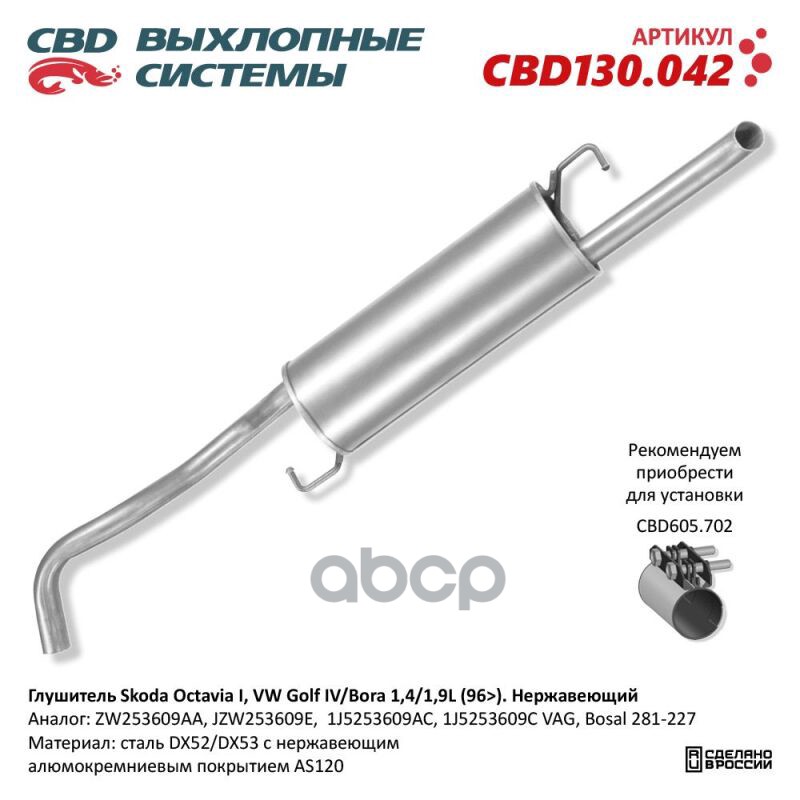 Глушитель CBD Skoda Octavia I VW Golf IV/Bora 14/19L 96- 1J5253609C нерж. сталь.