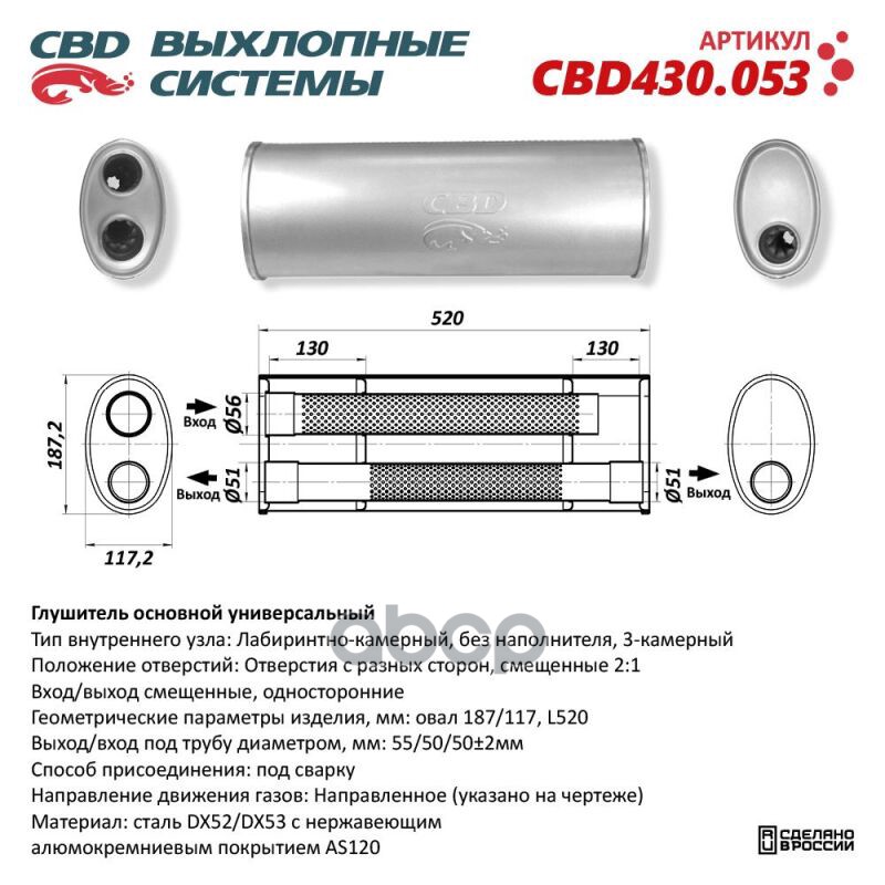 Чтобы купить Глушитель Нержавеющий. Овал D187/117, L520. Отверстия с разных сторон смещенные (2:1) под трубу 55⁄5 CBD CBD арт. CBD430053 оптом по цене 3358 руб., свяжитесь с поставщиком. Компания поставщик — For-cars (ИП «Иванов Алексей Валентинович») из города Москва. Доставка возможна самовывоз, транспортной компанией, авиатранспортом, железной дорогой. Способы оплаты: наличными, безналичная оплата, электронные деньги.