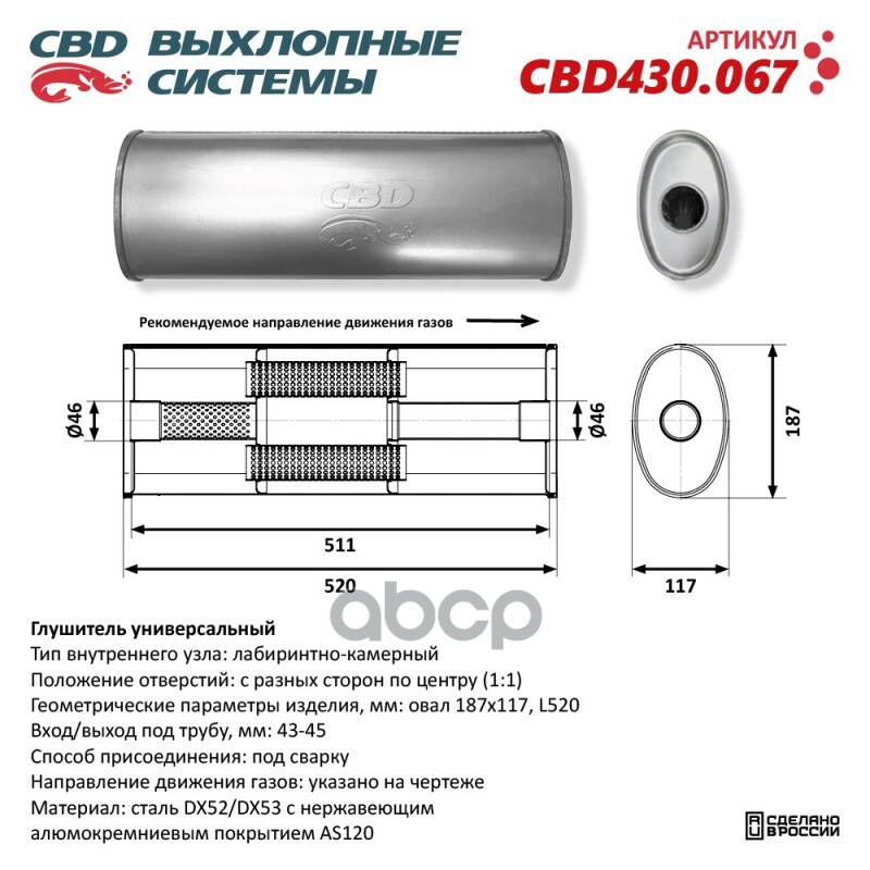 Чтобы купить Глушитель . Нержавеющий. Овал D187*117, L520. CBD арт. CBD430067 оптом по цене 2772 руб., свяжитесь с поставщиком. Компания поставщик — For-cars (ИП «Иванов Алексей Валентинович») из города Москва. Доставка возможна самовывоз, транспортной компанией, авиатранспортом, железной дорогой. Способы оплаты: наличными, безналичная оплата, электронные деньги.