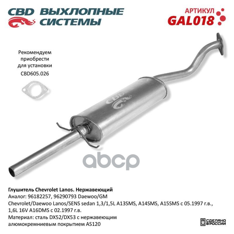 Чтобы купить Глушитель основной Lanos ‘СВD’ (нерж.) овальная банка CBD арт. GAL018 оптом по цене 3908 руб., свяжитесь с поставщиком. Компания поставщик — For-cars (ИП «Иванов Алексей Валентинович») из города Москва. Доставка возможна самовывоз, транспортной компанией, авиатранспортом, железной дорогой. Способы оплаты: наличными, безналичная оплата, электронные деньги.
