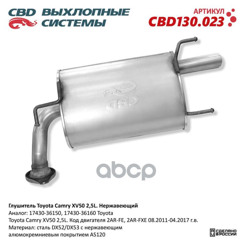 Чтобы купить Глушитель основной Toyota Camry XV50 2,5L ‘CBD’ (нерж.) CBD арт. CBD130023 оптом по цене 5358 руб., свяжитесь с поставщиком. Компания поставщик — For-cars (ИП «Иванов Алексей Валентинович») из города Москва. Доставка возможна самовывоз, транспортной компанией, авиатранспортом, железной дорогой. Способы оплаты: наличными, безналичная оплата, электронные деньги.