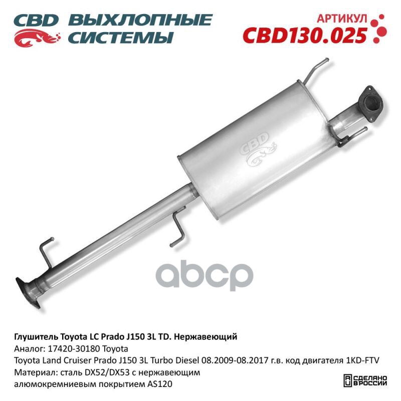 Чтобы купить Глушитель основной Toyota LC Prado J150 3L TD ‘CBD’ (нерж.) CBD арт. CBD130025 оптом по цене 7019 руб., свяжитесь с поставщиком. Компания поставщик — For-cars (ИП «Иванов Алексей Валентинович») из города Москва. Доставка возможна самовывоз, транспортной компанией, авиатранспортом, железной дорогой. Способы оплаты: наличными, безналичная оплата, электронные деньги.