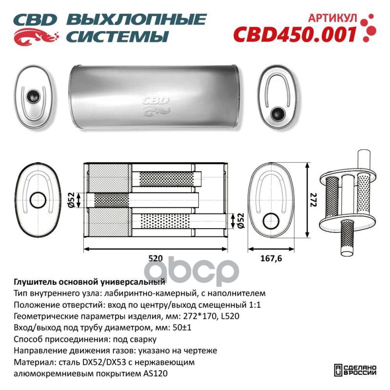 Глушитель основной универсальный ‘CBD’. Нерж сталь. Овал D272*170, L520. Отверстия по центру/смещенное, под трубу 501мм.
