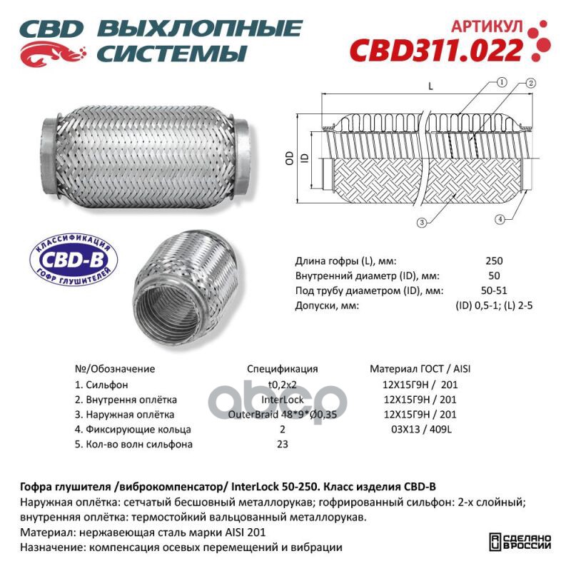 Гофра глушителя InterLock 50-250 (КЛАСС CBD-B) AISI 201