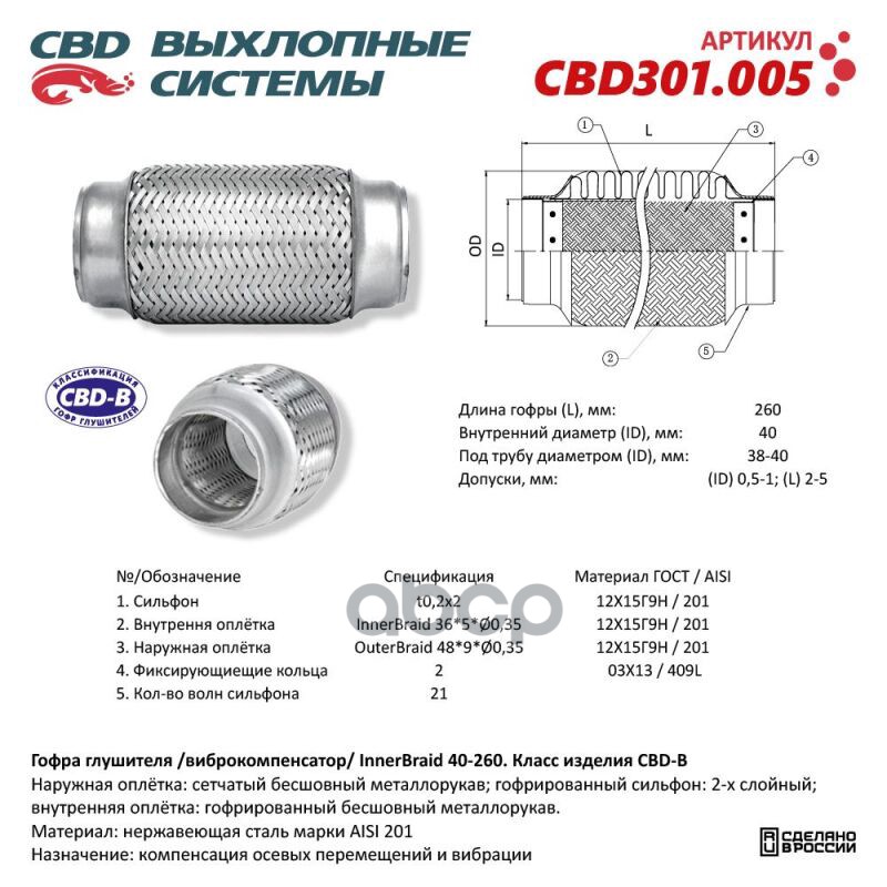 Чтобы купить Гофра приемной трубы d-40 L-260 (трехслойная) комп CBD арт. CBD301005 оптом по цене 848 руб., свяжитесь с поставщиком. Компания поставщик — For-cars (ИП «Иванов Алексей Валентинович») из города Москва. Доставка возможна самовывоз, транспортной компанией, авиатранспортом, железной дорогой. Способы оплаты: наличными, безналичная оплата, электронные деньги.