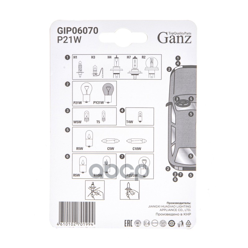 Чтобы купить Лампа 12V P21W 21W BA15s GANZ 2 шт. блистер GIP060 GANZ арт. GIP06070 оптом по цене 64 руб., свяжитесь с поставщиком. Компания поставщик — For-cars (ИП «Иванов Алексей Валентинович») из города Москва. Доставка возможна самовывоз, транспортной компанией, авиатранспортом, железной дорогой. Способы оплаты: наличными, безналичная оплата, электронные деньги.