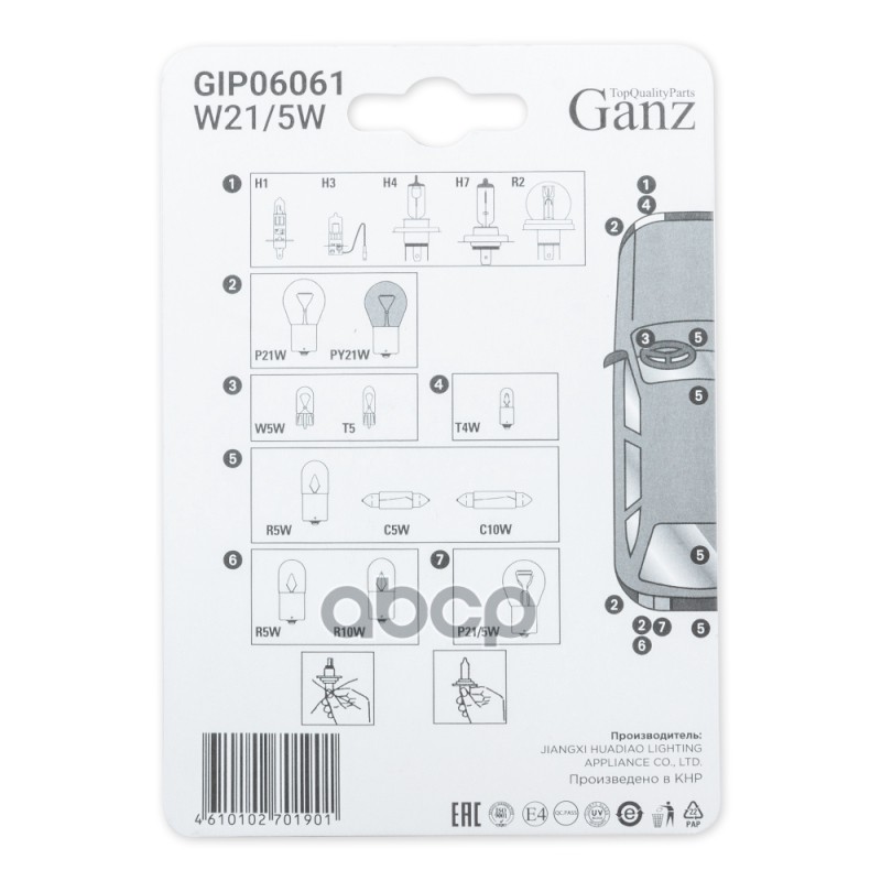 Чтобы купить Лампа 12V W21/5W 21/5W W3x16q GANZ 2 шт. блистер G GANZ арт. GIP06061 оптом по цене 130 руб., свяжитесь с поставщиком. Компания поставщик — For-cars (ИП «Иванов Алексей Валентинович») из города Москва. Доставка возможна самовывоз, транспортной компанией, авиатранспортом, железной дорогой. Способы оплаты: наличными, безналичная оплата, электронные деньги.