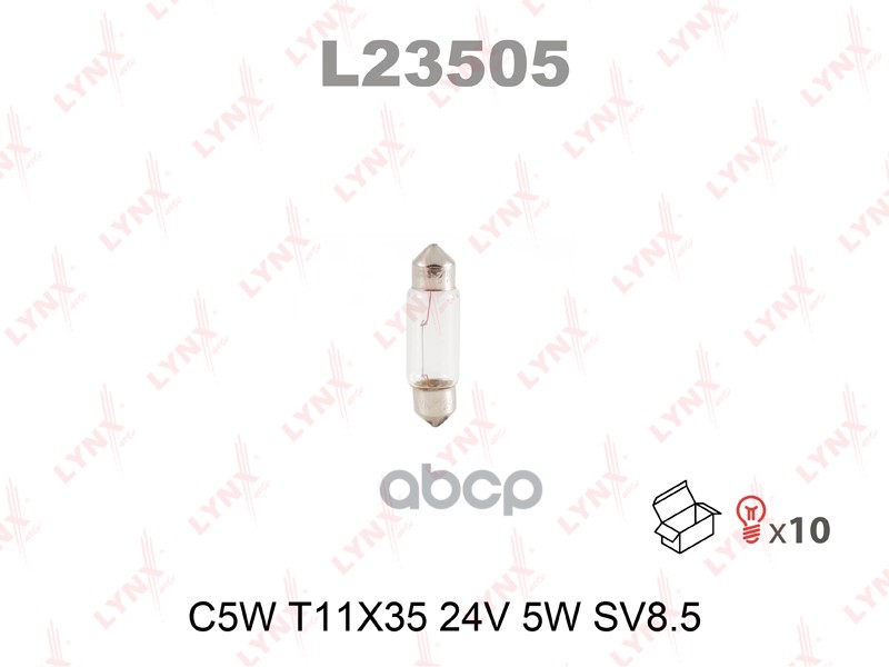 Чтобы купить Лампа накаливания C5W T11X35 24V 5W SV8.5 ( MIN 10ШТ ) LYNXauto арт. L23505 оптом по цене 24 руб., свяжитесь с поставщиком. Компания поставщик — For-cars (ИП «Иванов Алексей Валентинович») из города Москва. Доставка возможна самовывоз, транспортной компанией, авиатранспортом, железной дорогой. Способы оплаты: наличными, безналичная оплата, электронные деньги.