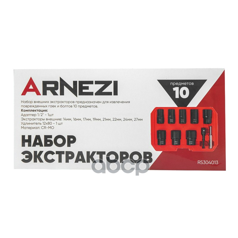 Чтобы купить Набор головок 1⁄2’ (экстракторов) для поврежденных гаек и болтов, 10 пр. (CR-MO) ARNEZI арт. R5304013 оптом по цене 3479 руб., свяжитесь с поставщиком. Компания поставщик — For-cars (ИП «Иванов Алексей Валентинович») из города Москва. Доставка возможна самовывоз, транспортной компанией, авиатранспортом, железной дорогой. Способы оплаты: наличными, безналичная оплата, электронные деньги.