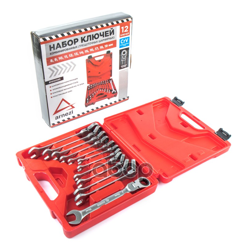 Набор ключей комбинированных 12пр. трещоточные, шарнирные в пластиковом боксе ARNEZI.