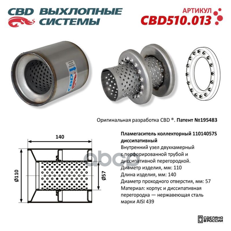 Чтобы купить Пламегаситель универсальный коллекторный 11014057s диссипативный, из нержавеющей стали CBD арт. CBD510013 оптом по цене 1559 руб., свяжитесь с поставщиком. Компания поставщик — For-cars (ИП «Иванов Алексей Валентинович») из города Москва. Доставка возможна самовывоз, транспортной компанией, авиатранспортом, железной дорогой. Способы оплаты: наличными, безналичная оплата, электронные деньги.