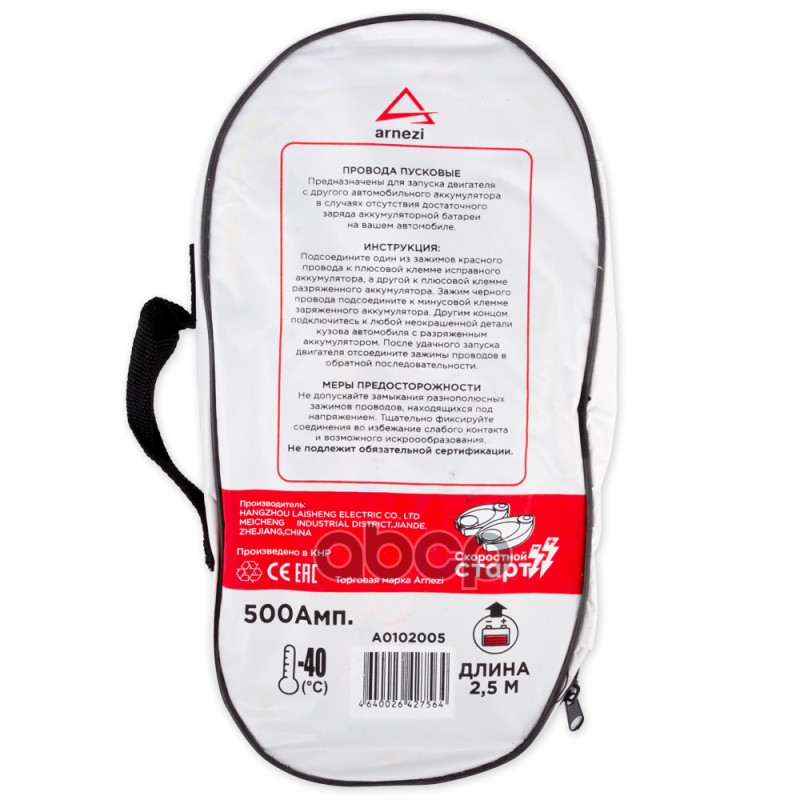 Чтобы купить ПРОВОДА прикуривателя 500А 2.5м (-40С) ARNEZI арт. A0102005 оптом по цене 939 руб., свяжитесь с поставщиком. Компания поставщик — For-cars (ИП «Иванов Алексей Валентинович») из города Москва. Доставка возможна самовывоз, транспортной компанией, авиатранспортом, железной дорогой. Способы оплаты: наличными, безналичная оплата, электронные деньги.