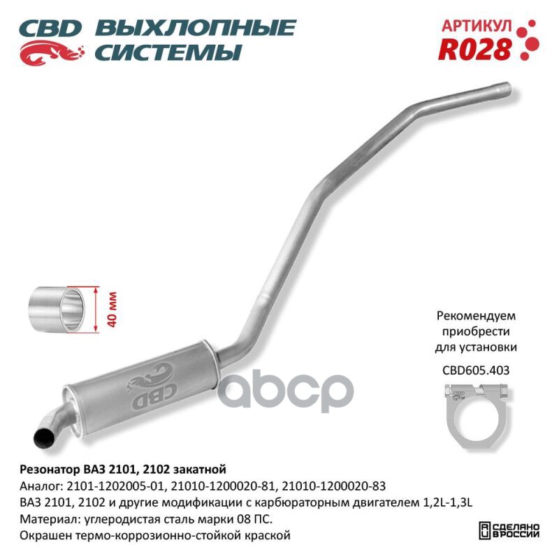 Чтобы купить Резонатор 2101 ‘СВД’ (г.Санкт-Петербург) (замена кода 102071) CBD арт. R028 оптом по цене 2225 руб., свяжитесь с поставщиком. Компания поставщик — For-cars (ИП «Иванов Алексей Валентинович») из города Москва. Доставка возможна самовывоз, транспортной компанией, авиатранспортом, железной дорогой. Способы оплаты: наличными, безналичная оплата, электронные деньги.