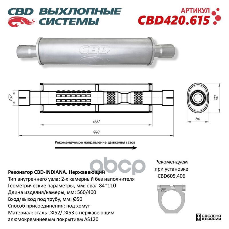 Резонатор CBD-INDIANA L560, овал 84x110мм, под трубу 50мм. Нержавеющий. CBD CBD4