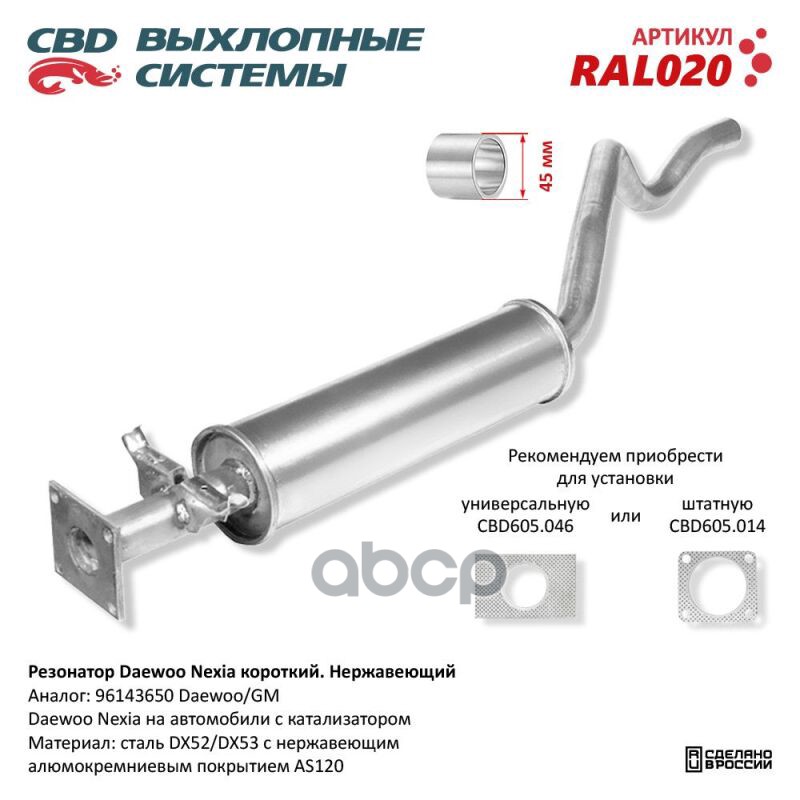 Чтобы купить Резонатор Nexia (короткий) под катал. ‘CBD’ (нерж.) (96143650) CBD арт. RAL020 оптом по цене 3501 руб., свяжитесь с поставщиком. Компания поставщик — For-cars (ИП «Иванов Алексей Валентинович») из города Москва. Доставка возможна самовывоз, транспортной компанией, авиатранспортом, железной дорогой. Способы оплаты: наличными, безналичная оплата, электронные деньги.
