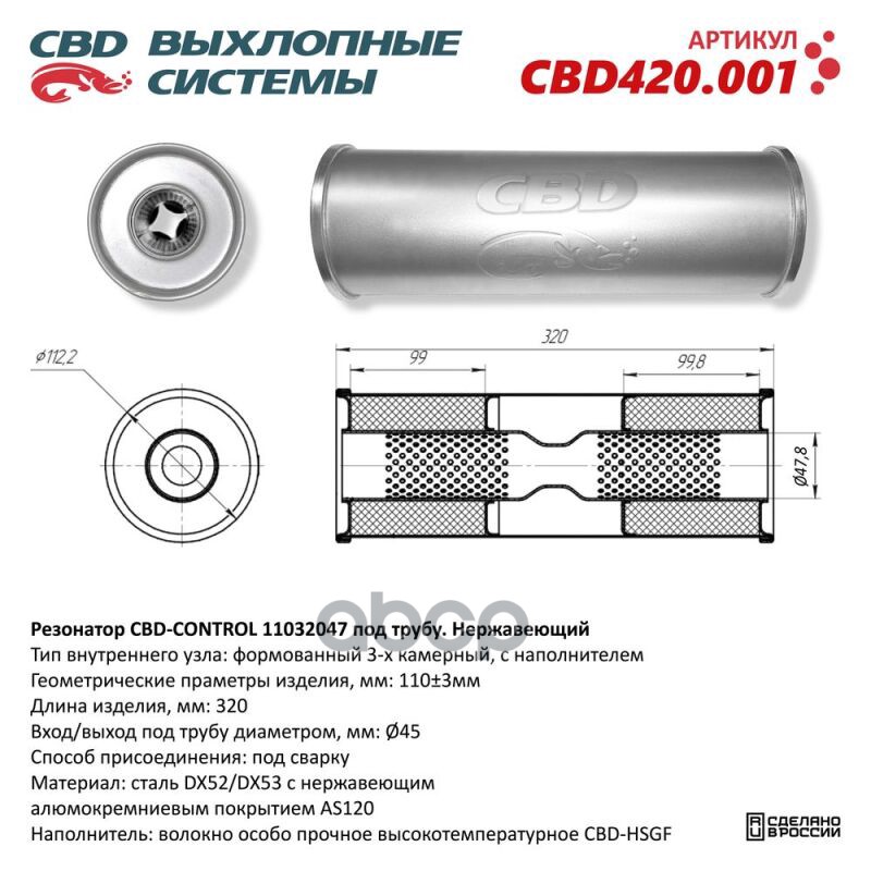 Чтобы купить Резонатор универсальный 11032047 под трубу. ‘CBD’ (нерж.) CBD арт. CBD420001 оптом по цене 2128 руб., свяжитесь с поставщиком. Компания поставщик — For-cars (ИП «Иванов Алексей Валентинович») из города Москва. Доставка возможна самовывоз, транспортной компанией, авиатранспортом, железной дорогой. Способы оплаты: наличными, безналичная оплата, электронные деньги.